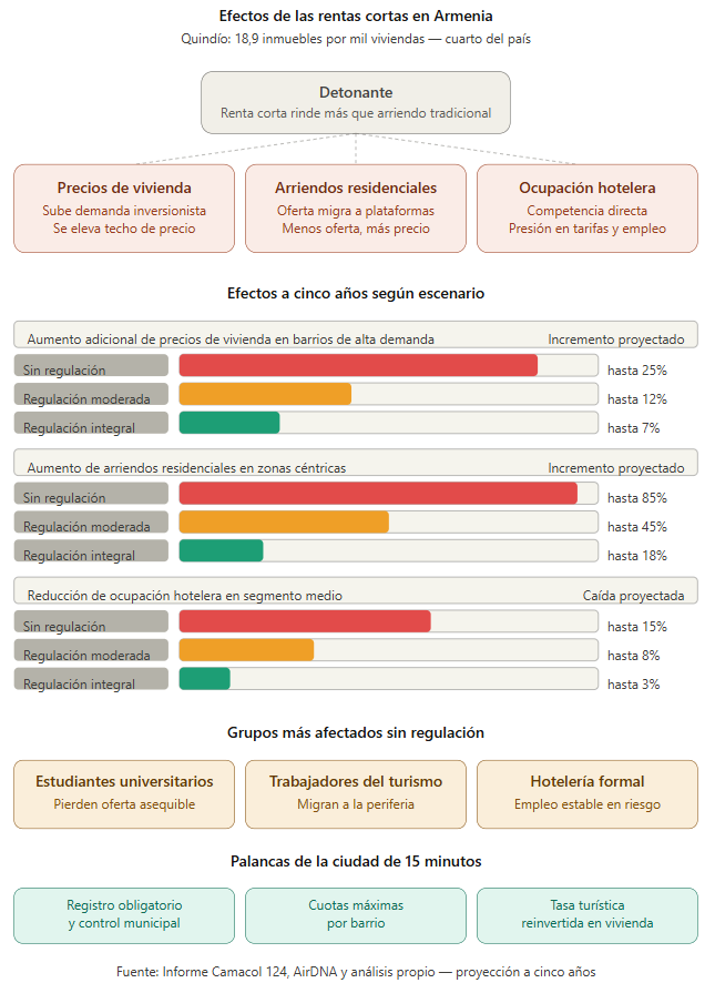 El fenómeno de rentas cortas en Armenia ya está teniendo efectos medibles sobre precios de vivienda, arriendos y ocupación hotelera, y esos efectos se acelerarán en los próximos años si no hay intervención. La magnitud final dependerá íntegramente de la decisión política de regular tempranamente o dejar que el mercado se autorregule por saturación. La experiencia de Medellín y Cartagena muestra que la autorregulación por saturación es costosa socialmente y difícil de revertir.