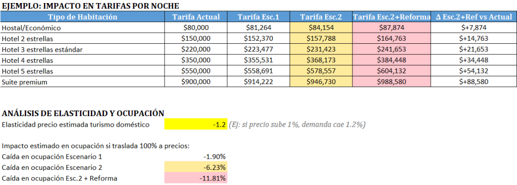 El aumento de las tarifas tiene implicaciones en la ocupación. Asumiendo una elasticidad precio unitaria de -1.2, la caída de la ocupación por el aumento del mínimo y la reforma laboral podría llegar el -11.81%. Lo anterior significa un desafío considerable para el sector hotelero que enfrenta una alta informalidad con los arriendos de corta duración.