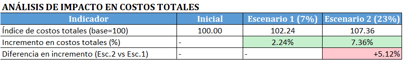 El escenario del 23% de aumento salarial genera un incremento en precios al consumidor 3.3 veces mayor que el escenario del 7%, lo que presiona tanto a las empresas (márgenes) como a los consumidores (poder adquisitivo), con riesgo de retroalimentar la inflación e incentivar la informalidad laboral.