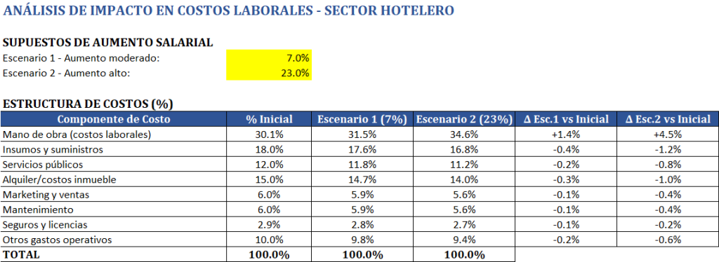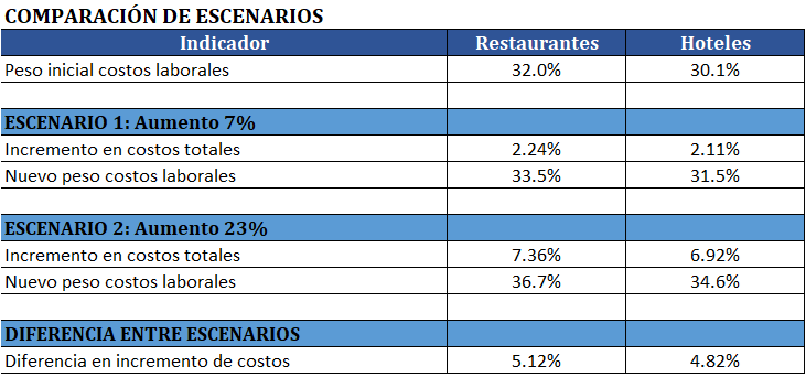 Se realizó un análisis de sensibilidad de la contribución de los costos laborales al sector de restaurantes y hoteles, mediante dos escenarios de aumento del salario mínimo: