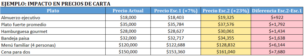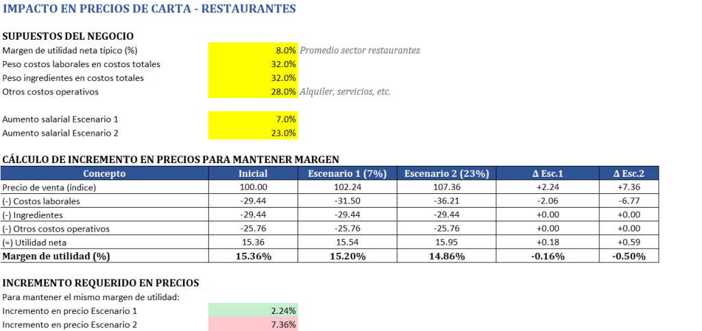 Para compensar el aumento de los salarios, el incremento en precios en la carta de los restaurantes debe ser en promedio del 7.36%. Por ejemplo, para los siguiente precios se debería aplicar los aumento correspondientes: