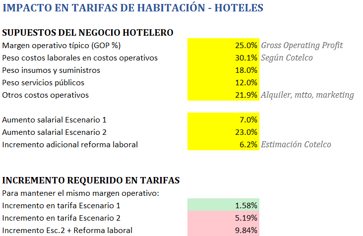 El ajuste en precios para mantener el beneficio de los hoteles indica que el aumento debería ser del 5.19% para el aumento del salario mínimo y del 9.48% con la reforma laboral incluída.