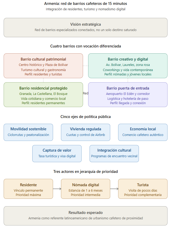En lugar de convertir a Armenia en un solo gran destino turístico concentrado, la propuesta es configurar una red de tres o cuatro barrios de 15 minutos especializados y complementarios, conectados entre sí por transporte público eficiente y ciclorrutas, donde residentes, turistas y nómadas digitales coexistan bajo regulación clara. Cada barrio tendría una vocación diferenciada pero cumpliría las condiciones básicas del modelo: proximidad funcional, mezcla de usos, movilidad activa, espacios públicos de calidad y vivienda diversa.