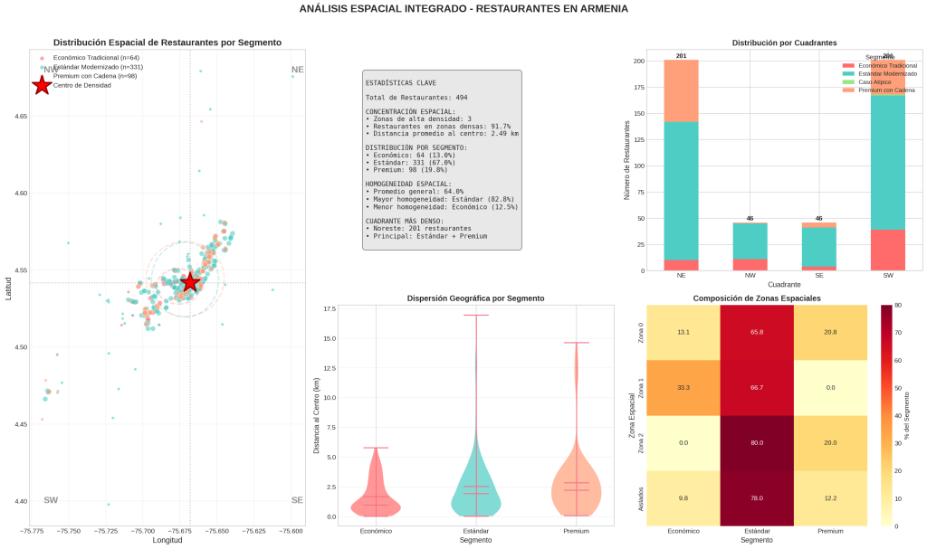 5. Segmentación espacial: Los diferentes segmentos muestran patrones de ubicación distintivos, con los restaurantes económicos más cercanos al centro (1.68 km) y los premium más alejados (2.85 km).