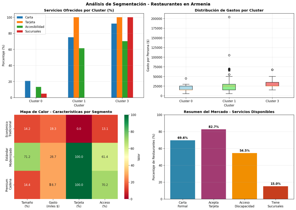 El análisis de clustering multidimensional del mercado gastronómico de Armenia revela una estructura compleja con claras oportunidades de desarrollo. La identificación de cuatro segmentos distintivos, combinada con el análisis espacial, proporciona una comprensión integral del mercado que permite la formulación de estrategias específicas para cada grupo de stakeholders.