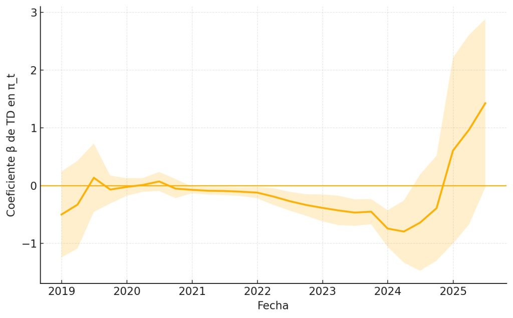 La estabilidad temporal del parámetro revela, sin embargo, un cambio de régimen. Las estimaciones por submuestras muestran una pendiente negativa antes y durante los choques 2020–2022, y positiva en la fase de normalización: