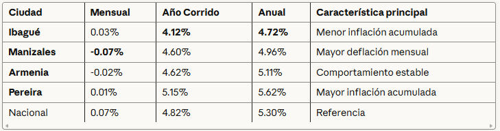 Ibagué es la ciudad con mejor desempeño acumulado: su inflación año corrido (4.12%) y anual (4.72%) son las más bajas entre las cuatro ciudades. Esto refleja una dinámica de precios más moderada a lo largo del año.