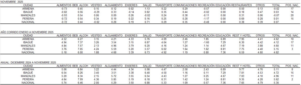 Armenia presenta un comportamiento inflacionario favorable respecto al promedio nacional en los tres indicadores. En noviembre registró deflación (-0.02%), impulsada principalmente por la caída en alimentos (-0.73%) y recreación (-0.57%).