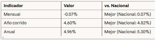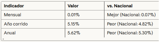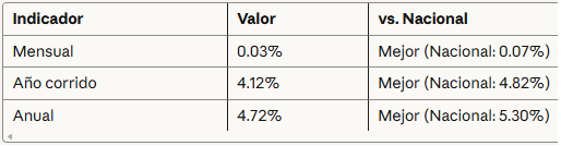 Ambos indicadores se mantienen por debajo de los promedios nacionales respectivos (4.82% y 5.30%), evidenciando una menor velocidad en el encarecimiento del costo de vida local frente al agregado país.