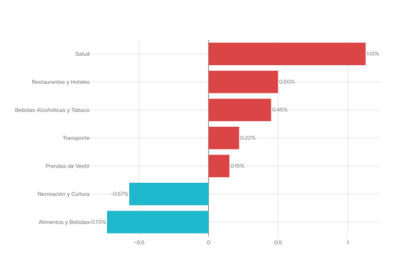 - Contribución positiva (Servicios y regulados): Las presiones inflacionarias se concentraron en las divisiones de Salud (0.71%), Bebidas alcohólicas y tabaco (0.44%) y Bienes y servicios diversos (0.39%).