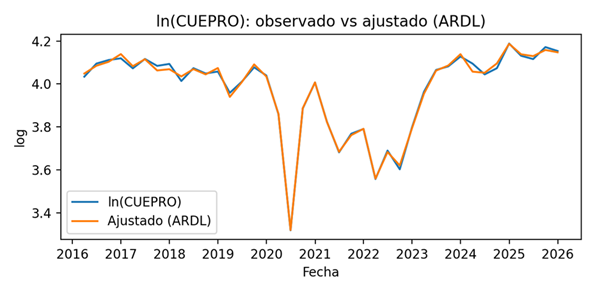 Con base en los resultados del ARDL en logaritmos (2015T1–2025T4) para ln(CUEPRO), la lectura económica más clara es que la cuenta propia está dominada por la dinámica del mercado laboral (ocupación, inactividad, empleo particular y desempleo), mientras que actividad real (VABREAL) e inflación (IPCAMX) no aparecen como determinantes estadísticamente robustos dentro de esta especificación.