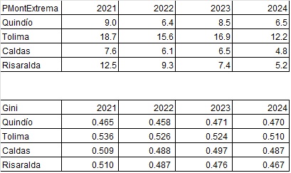 - Si el Gini del Quindío cae menos que en Caldas/Risaralda (o incluso empeora), es coherente observar desacople entre crecimiento y bienestar de los hogares en la base de la distribución.