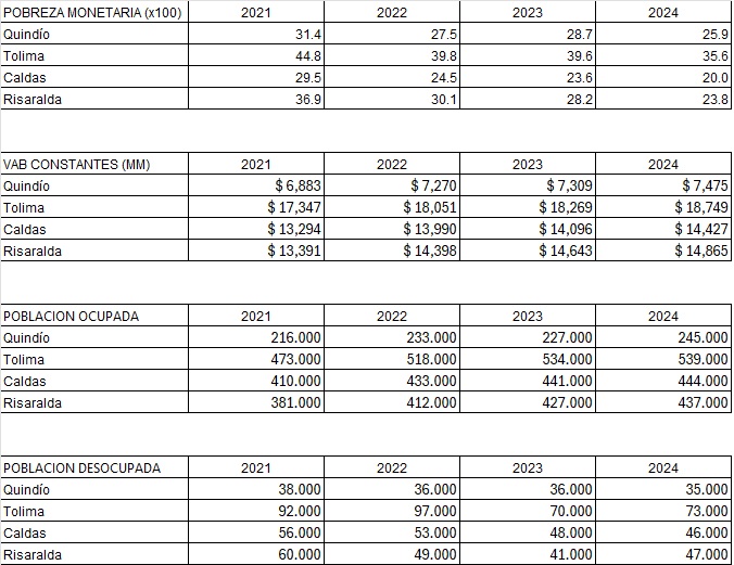 El análisis de los datos muestra que la reducción de la pobreza monetaria en el Quindío (-5,5 p.p. entre 2021–2024) ha sido una de las más lentas que en los otros departamentos del Eje Cafetero y Tolima. A continuación se resumen los resultados y las causas estructurales observadas a partir de los indicadores de VAB real, ocupación y desocupación: