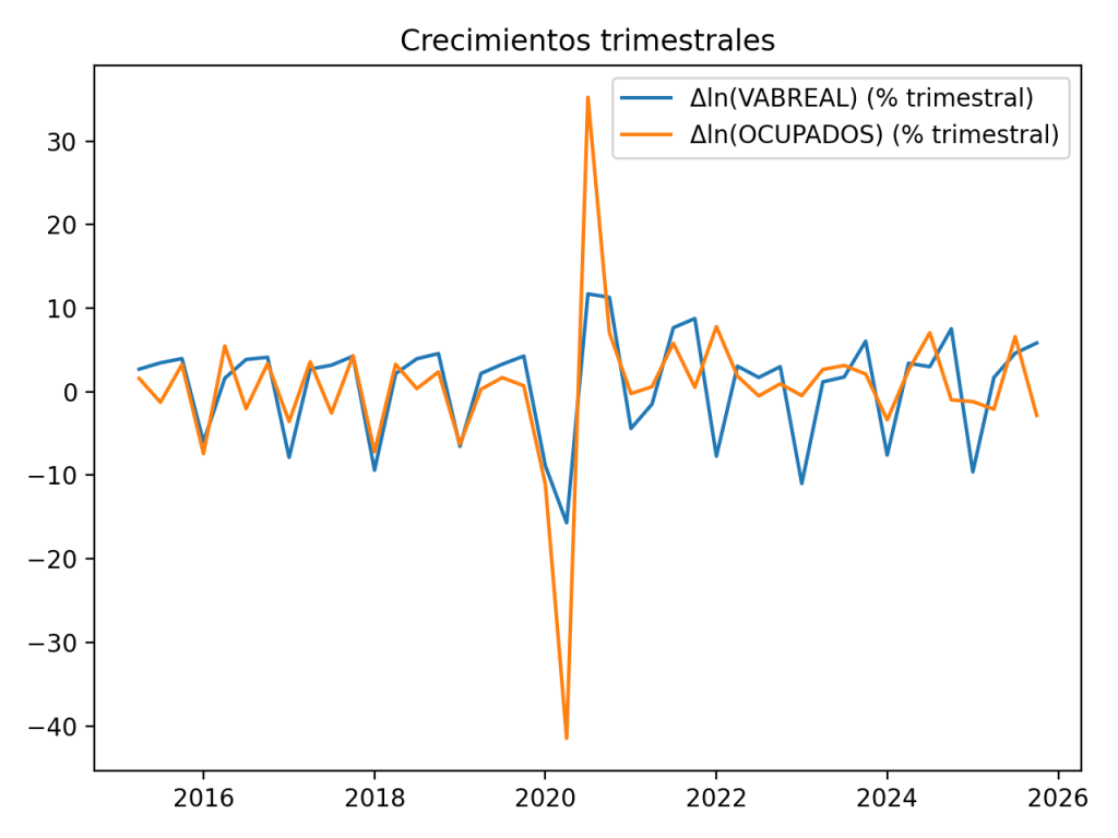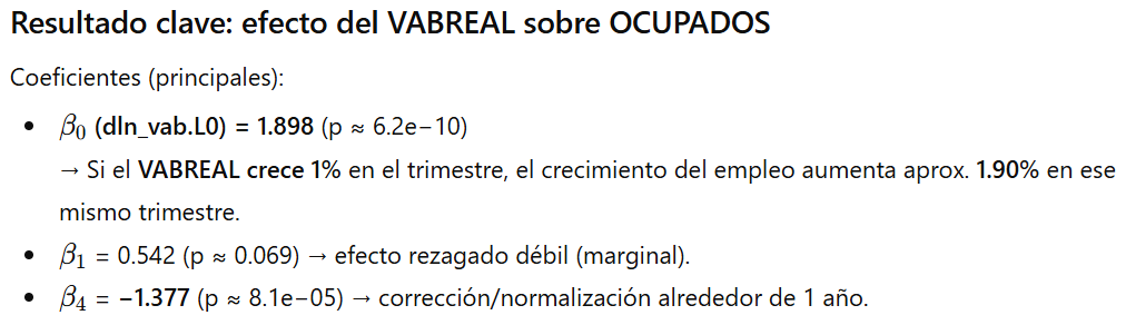 Relación positiva y fuerte en el corto plazo (impacto contemporáneo): el coeficiente de Δln(VABREAL_t) es ≈ 1.90 y es altamente significativo. En la práctica: cuando el VAB real crece 1% en un trimestre, el empleo tiende a crecer ~1.9% ese mismo trimestre (en promedio, manteniendo constante la dinámica pasada del empleo).