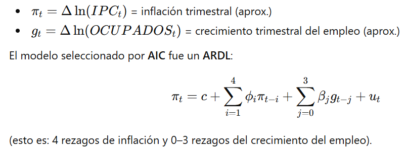 Persistencia propia del empleo (inercia): los rezagos de Δln(OCUPADOS) son relevantes (en especial L1 negativo y L4 positivo), indicando que el empleo tiene dinámica interna: lo que pasó en trimestres anteriores influye en el crecimiento actual (ajustes, ciclos, “rebotes” estacionales o de corrección).