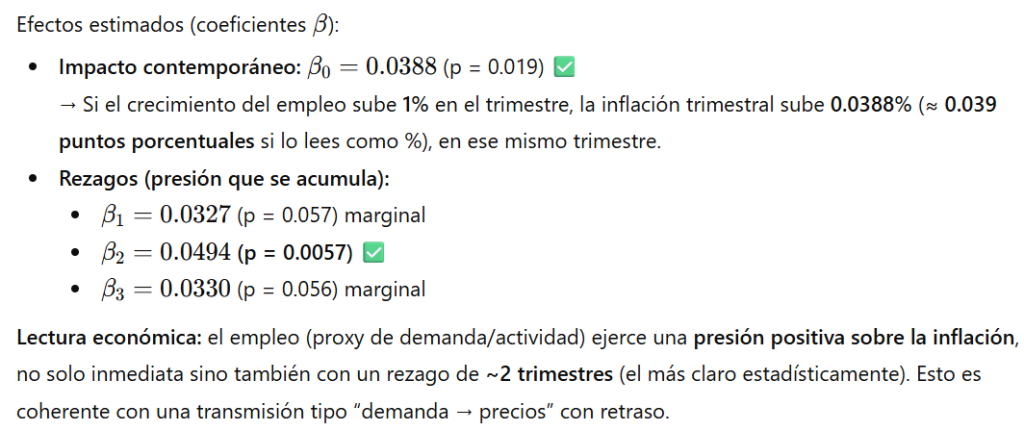 Efecto con dinámica y “corrección” a un año: aparece un rezago negativo y significativo en t−4 (≈ −1.38). Esto sugiere que parte del impulso del crecimiento del VAB sobre el empleo no es permanente: después de cerca de un año hay normalización/ajuste (por ejemplo, se revierte una parte del crecimiento del empleo asociado a un shock transitorio del VAB).