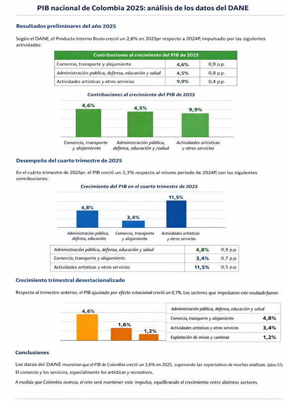 El Departamento Administrativo Nacional de Estadística (DANE) publicó las cifras preliminares del Producto Interno Bruto (PIB) nacional para 2025. La estimación muestra que el PIB creció 2,6 % en términos reales frente a 2024. Se trata de un resultado ligeramente superior al crecimiento de 1,5 % registrado en 2024 y del 0,8% de 2023, pero inferior a los esperado por los analistas y confirma una recuperación moderada de la economía colombiana.