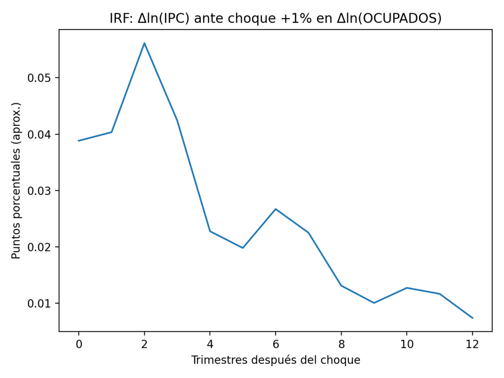 Esa expansión del empleo, interpretada como mayor demanda/actividad, empuja el IPC al alza, pero en una magnitud moderada (décimas de punto por trimestre), acumulando alrededor de 1% en el nivel de precios en ~3 años.
