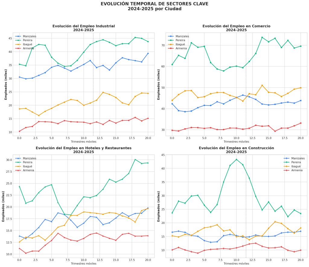 • Industria manufacturera: +19.200 empleos (+18.5%), con Pereira y Manizales como principales beneficiarios