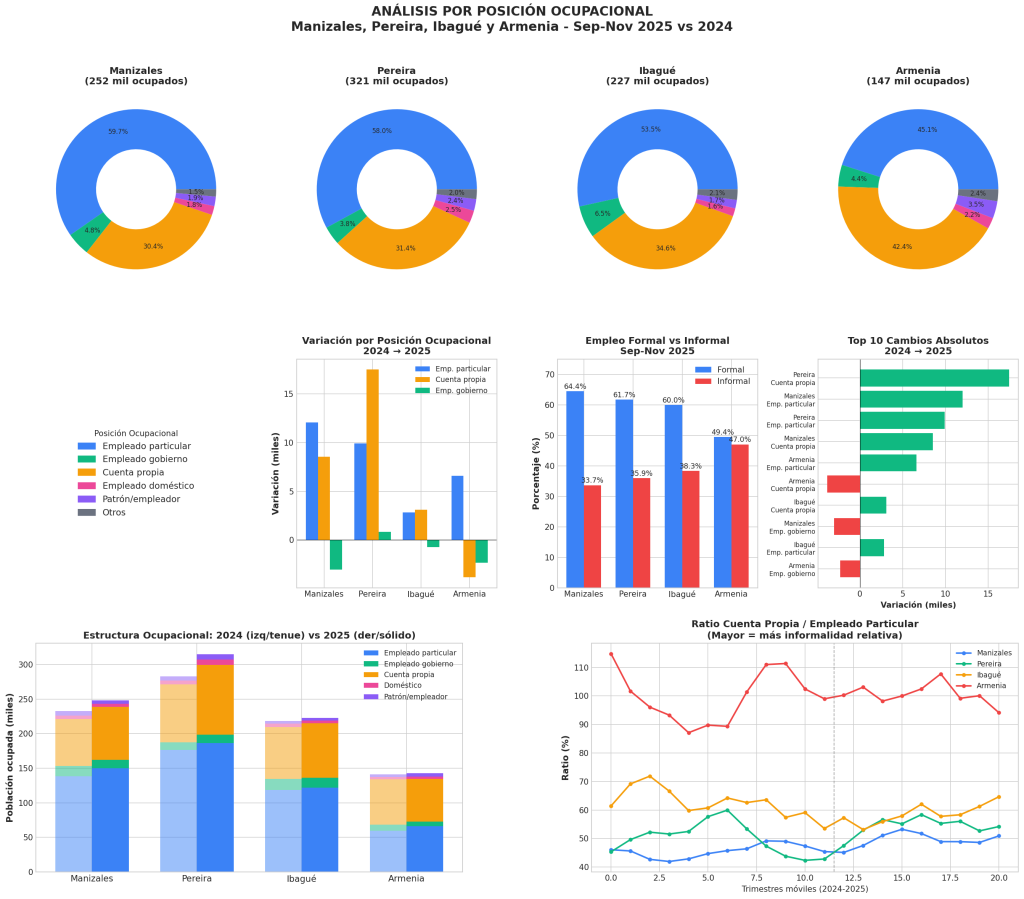 Crecimiento del trabajo por cuenta propia: Este segmento mostró un fuerte dinamismo, especialmente en Pereira (+17.500 trabajadores, +20.9%). Sin embargo, esto también refleja la expansión del empleo informal.
