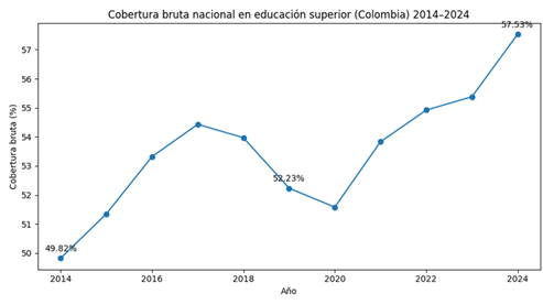 En los últimos diez años, el acceso a la educación superior en Colombia ha crecido considerablemente. Según el informe 123 del Laboratorio de Economía de la Educación (LEE) de la Universidad Javeriana, entre 2014 y 2024 se ha registrado un progreso constante en la inclusión de jóvenes en el sistema educativo superior, al aumentar la cobertura bruta nacional del 49,82 % al 57,53 %.
