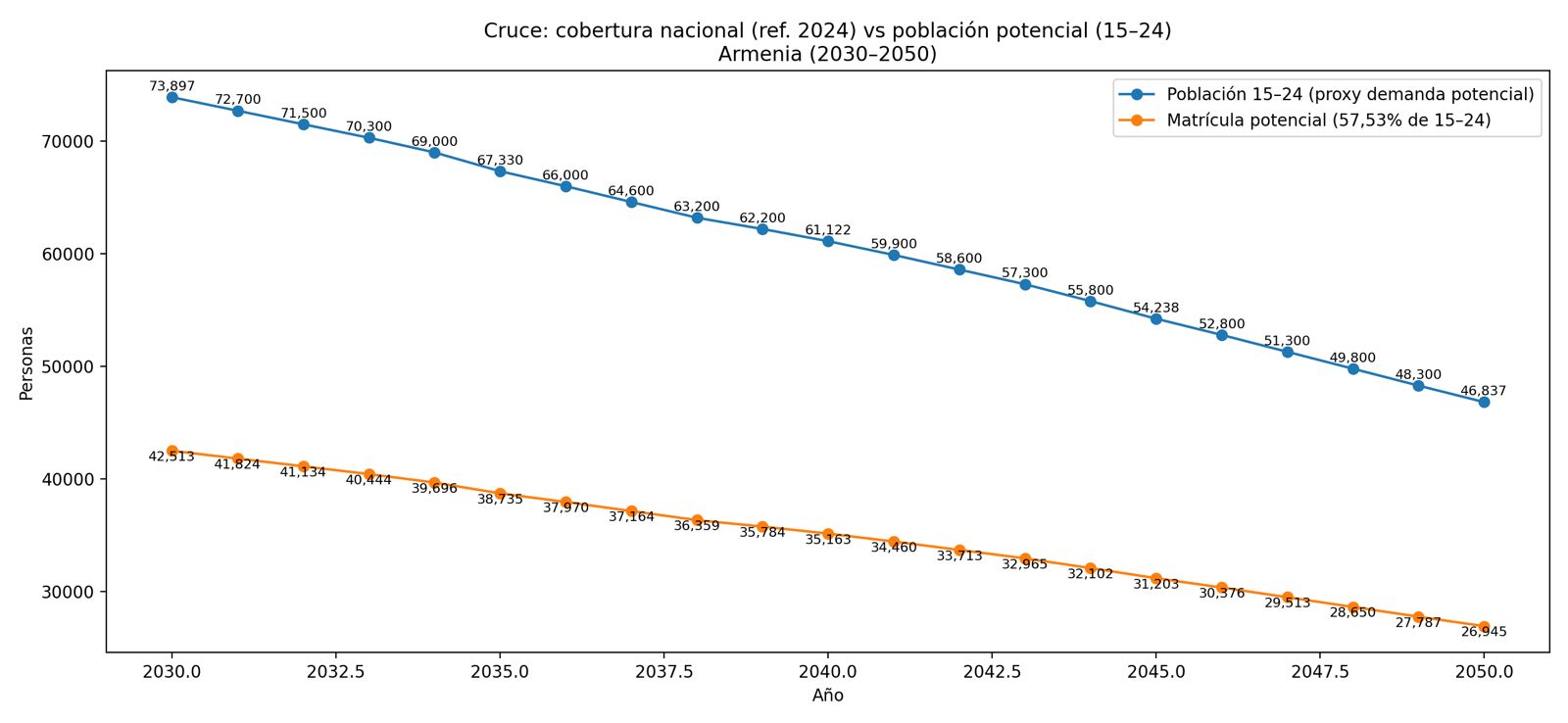 Gráfica 2. Cruce entre cobertura nacional y población potencial (15–24 años) en Armenia (2030–2050)