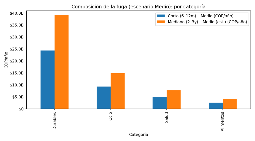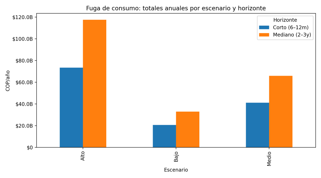 Interpretación rápida: si el abaratamiento del viaje consolida el hábito de “comprar/atenderse/salir” en Pereira, la fuga puede prácticamente duplicarse en 2–3 años.