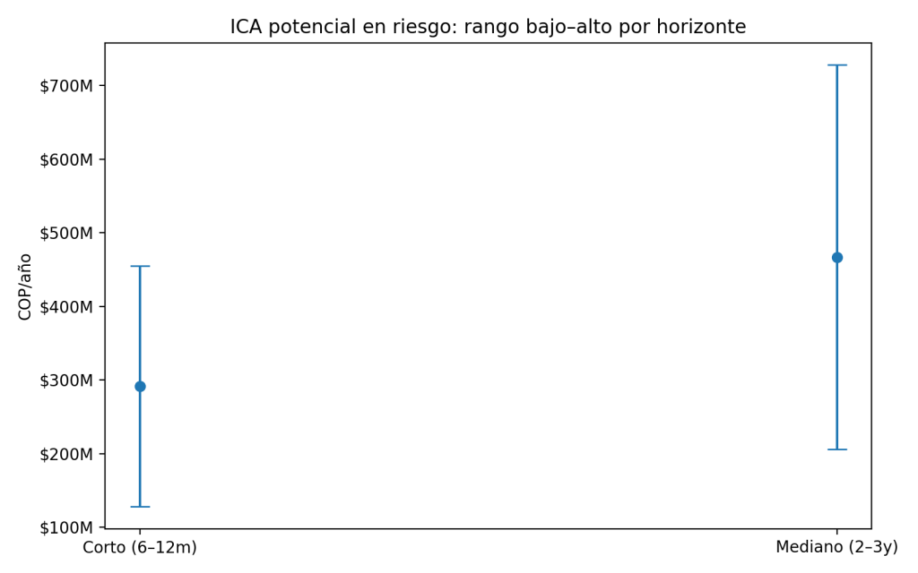- Mediano plazo: entre $206 millones/año (bajo) y $728 millones/año (alto)