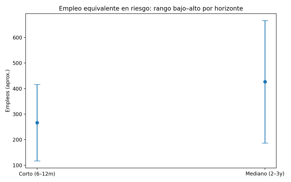 - Corto plazo: ~117 (bajo) a ~416 (alto) empleos equivalentes