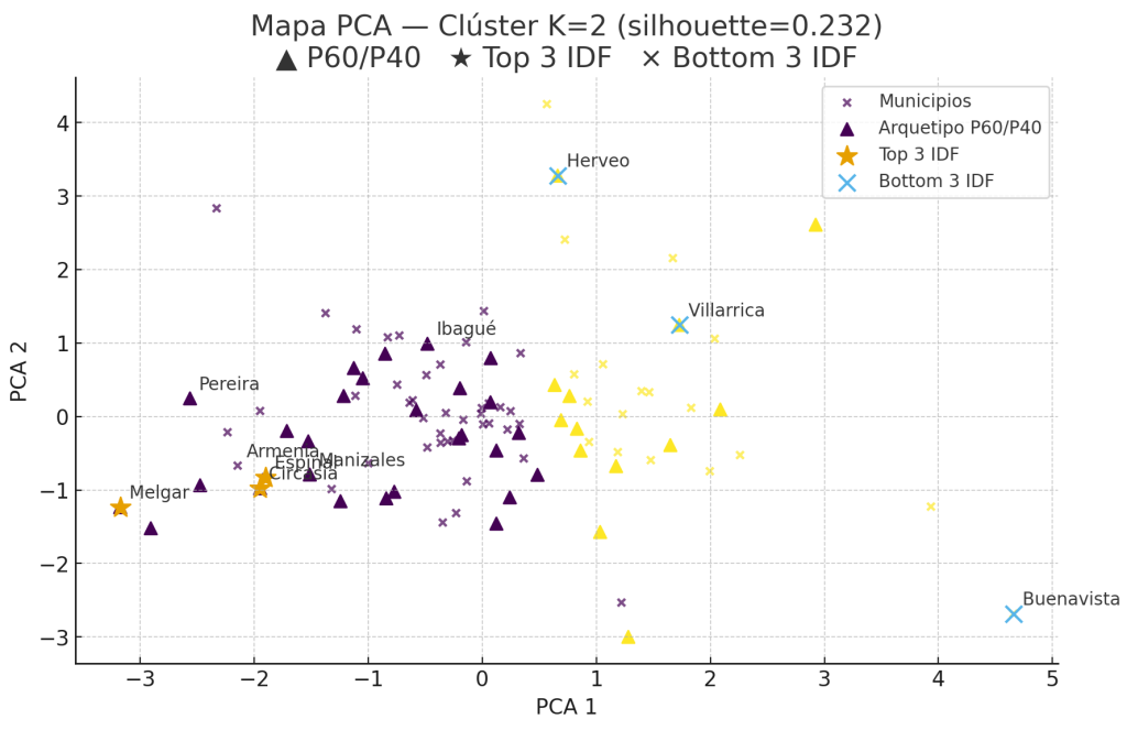 - Con el corte P60/P40 y el mapa PCA: Ibagué, Manizales y Pereira aparecen con margen para mejorar ejecución. Armenia queda fuera del flag, relativamente mejor en ejecución frente al umbral usado.