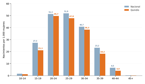 El Quindío presenta un perfil de fecundidad que se distingue del promedio nacional en varios aspectos. En 2025pr, la TEFE más alta del Quindío correspondió al grupo de 20 a 24 años (49,7 por 1.000 mujeres), seguido por el grupo de 25 a 29 años (47,8). Si bien la diferencia entre ambos grupos es menor (1,9 puntos), el Quindío aún no ha completado el desplazamiento del pico de fecundidad al grupo de 25–29 que ya se observa a nivel nacional (51,3 vs. 51,9).