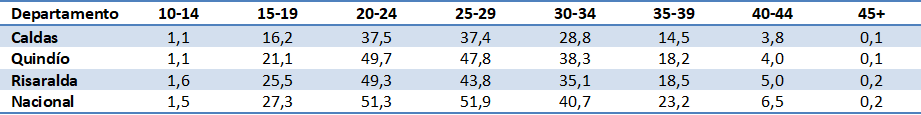 Tasas específicas de fecundidad según departamento de residencia de la madre en el Eje Cafetero. Año 2025pr