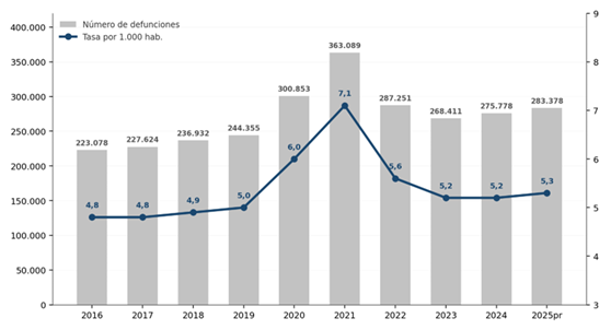 La estructura de la mortalidad por sexo y grupos de edad mantiene los patrones históricos: mayor mortalidad masculina entre los 20 y 79 años, y superioridad de la mortalidad femenina únicamente a partir de los 85 años. Un dato positivo es la reducción de la mortalidad en la niñez (menores de 5 años), cuya participación en el total pasó del 4,0 % en 2016 al 1,9 % en 2025pr.