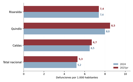 En 2025pr, 23 departamentos y Bogotá reportaron aumentos en la tasa bruta de mortalidad. El Eje Cafetero presenta tasas sistemáticamente superiores al promedio nacional, consistente con una estructura poblacional más envejecida que el resto del país.