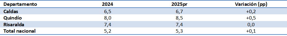 En el Eje Cafetero, la dinámica fue heterogénea. Caldas registró una variación de –7,2 % y Risaralda de –7,5 %. Mientras tanto, Quindío se destacó como uno de los pocos departamentos del país que revirtieron la tendencia negativa, con un aumento del 1,3 % frente a 2024. Este dato contrasta con la pronunciada caída del 11,7 % que el departamento había registrado entre 2023 y 2024.
