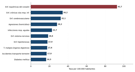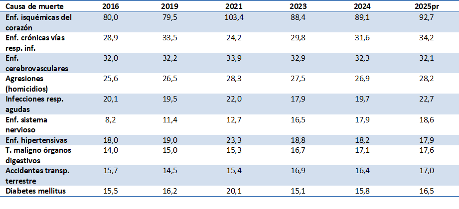 Las enfermedades crónicas de las vías respiratorias inferiores (34,2) y las enfermedades cerebrovasculares (32,1) ocupan el segundo y tercer lugar respectivamente. Los homicidios son la cuarta causa con una tasa de 28,2, en ascenso frente a 2024 (26,9). Las infecciones respiratorias agudas (22,7) alcanzan la tasa más alta registrada desde 2016, ubicándose en quinta posición.