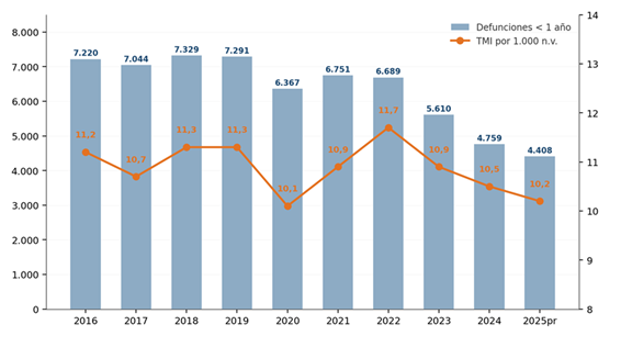 La tasa de mortalidad infantil (TMI) —probabilidad de fallecer antes del primer año de vida— es un indicador sensible del desarrollo social y sanitario. En 2025pr, la TMI se situó en 10,2 defunciones por cada 1.000 nacidos vivos, continuando la tendencia descendente: 351 defunciones menos que en 2024 y 2.281 menos que en 2022. La tasa ha descendido desde 11,7 en 2022, lo que refleja mejoras en la atención materno-infantil y neonatal.