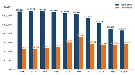 En términos acumulados, entre 2016 y 2025pr el país perdió 213.843 nacimientos anuales, lo que equivale a una reducción del 33,0 % respecto al volumen de 2016 (647.521). Esta contracción tiene implicaciones fiscales y de política pública de primer orden: menor demanda futura de cupos educativos, ajustes en la pirámide poblacional y presión creciente sobre el sistema pensional.