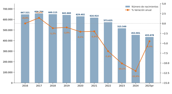 En el año 2025pr, Colombia registró un total de 433.678 nacimientos, cifra que representa 20.223 nacimientos menos que en 2024 y una reducción del 4,5 %. Si bien la tendencia a la baja se mantiene desde 2017, el ritmo de descenso se ha desacelerado significativamente: entre 2022 y 2024 la caída interanual osciló entre el 7,0 % y el 12,0 %, mientras que en 2025pr la contracción fue de apenas 4,5 %. Este comportamiento sugiere una posible estabilización en el mediano plazo, aunque los niveles absolutos continúan siendo los más bajos registrados en la última década.