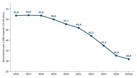La tasa general de fecundidad (TGF), que mide el número de nacimientos por cada 1.000 mujeres entre 15 y 49 años, alcanzó en 2025pr su valor más bajo de la última década: 30,9 nacimientos. El descenso frente a 2024 fue de 1,7 puntos, una reducción más moderada que la registrada en 2023 y 2024, cuando la caída fue de 4,8 puntos en cada año. En perspectiva, la TGF se redujo un 40,3 % entre 2016 (51,8) y 2025pr (30,9).