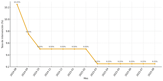 En junio y julio de 2025 la Junta Directiva mantuvo la tasa de interés de política en 9,25 % pese a la presión del Gobierno para acelerar la reducción. La decisión de mantener la tasa fue apoyada por cuatro de los siete miembros; uno votó por reducirla 25 pb y dos por recortar 50 pb. La junta argumentó que era necesario un enfoque cauteloso debido a la incertidumbre fiscal y al repunte de las expectativas de inflación. BBVA Research destaca que en julio se mantuvo la tasa con un mensaje más restrictivo: cuatro miembros votaron por dejarla inalterada, dos por recortar 50 pb y uno por reducir 25 pb; el comunicado subrayó que la inflación subyacente y las expectativas permanecen estables y que la actividad económica muestra un repunte impulsado por servicios. Esta división evidencia la tensión entre los codirectores nominados por el Gobierno, partidarios de recortes más rápidos, y los miembros tecnocráticos, más prudentes.