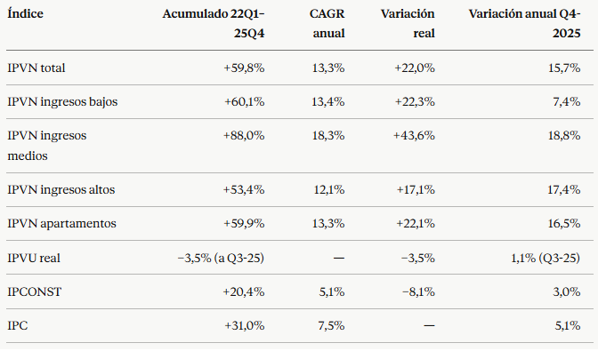 Pero a lo largo de 2025 los precios se reactivaron con fuerza: la variación anual volvió a 8,0% en Q1, 10,7% en Q2, 13,9% en Q3 y 15,7% en Q4 2025. Es decir, al cierre de 2025 los precios de vivienda nueva crecen al triple del IPC (5,1%) y más de cinco veces el ritmo del IPCONST (3,0%). Ingresos medios y altos lideran esta reaceleración, mientras que ingresos bajos se desaceleró (del 13,7% en Q4 2024 al 7,4% en Q4 2025).