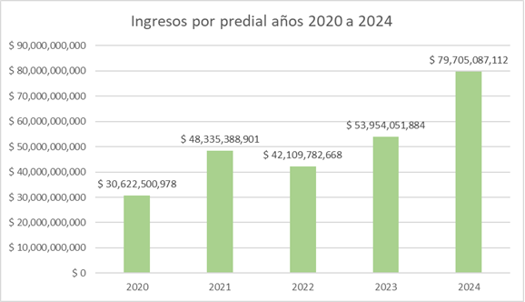 Antes de la actualización catastral del año 2022, el recaudo no tenía un patrón claro de aumento, como lo demuestran las cifras de los años 2020 (afectado por la pandemia), las cifras del año 2021, vigencia en el cual se recaudó lo que no se había podido cobrar en el año 2020 debido a los diferentes cierres programados. Prueba de lo anterior es que durante el año 2021 el predial de vigencias anteriores representó el 24% de la totalidad del recaudo frente al 15% en promedio de los años 2022, 2023 y 2024.