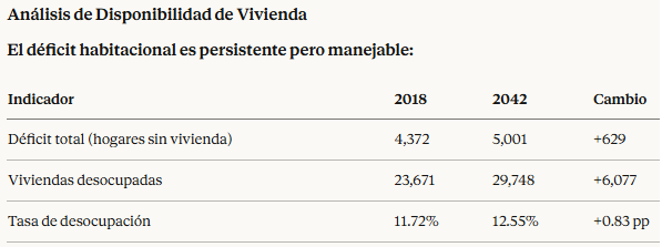 Se evidencia una paradoja central. Existe un déficit habitacional de aproximadamente 5,000 hogares proyectado a 2042, pero simultáneamente habrá casi 30,000 viviendas desocupadas. Las viviendas vacías podrían absorber casi 6 veces el déficit existente. Esto sugiere que el problema no es de oferta física de vivienda, sino de acceso, asequibilidad o inadecuación de la oferta existente.