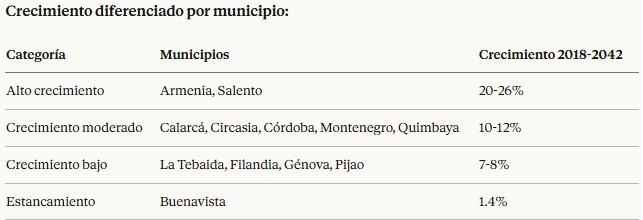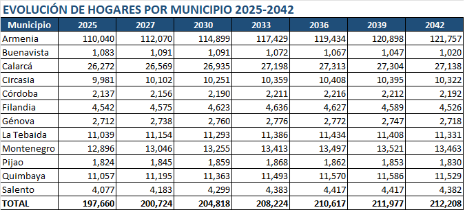 El Quindío proyecta un crecimiento moderado pero sostenido: pasará de 182,609 hogares en 2018 a 212,208 en 2042, un incremento de 29,599 hogares (+16.21%). Este crecimiento es inferior al promedio nacional proyectado por el DANE, confirmando lo mencionado en líneas anteriores sobre la dinámica más contenida de los departamentos de la zona cafetera.