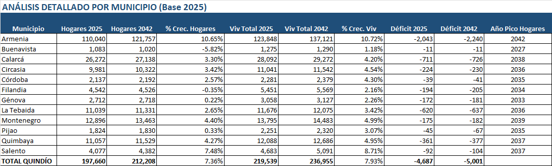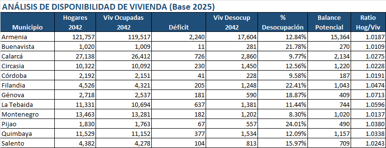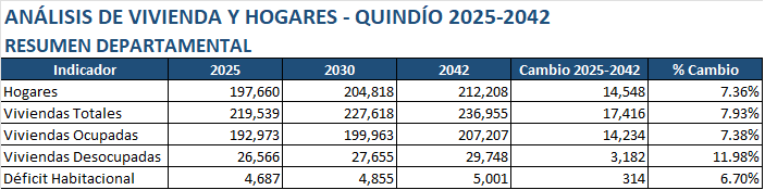 - Para Armenia: Enfoque en nueva construcción de vivienda social dado el volumen del déficit (2,240 hogares en 2042) y crecimiento sostenido.
