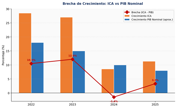 2024–2025: Desaceleración preocupante. El ICA creció solo 8,6% y 11,3%, tasas que apenas acompañan al PIB nominal. En 2024 la brecha fue negativa (-1,4 pp), indicando que por primera vez el ICA no capturó todo el crecimiento económico. En 2025 la brecha vuelve a ser ligeramente positiva (+3,3 pp), pero la tendencia descendente es clara: el impulso de 2022-2023 se agotó, debido principalmente a la aparición de las plataformas electrónicas de comercio que afectan el desempeño del sector.