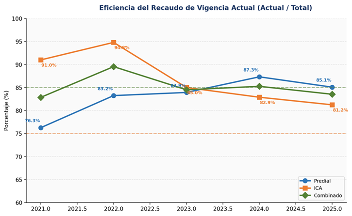 El Predial ha sido la historia de éxito relativa del período. La actualización catastral de 2022 transformó el recaudo, pasándolo de $48.335 millones (2021) a $114.738 millones (2025), un crecimiento del 137,4%. La eficiencia del recaudo mejoró de 76,3% a 85,1%, cruzando el umbral de aceptabilidad. Sin embargo, tres riesgos emergen:
