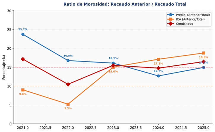 El ratio de morosidad mide la proporción del recaudo total que proviene de vigencias anteriores. Se calcula como: Recaudo de Vigencias Anteriores / Recaudo Total. Un valor alto y persistente indica que los contribuyentes no pagan oportunamente, lo cual constituye una forma pasiva de evasión: el contribuyente retrasa el pago indefinidamente esperando amnistías, prescripciones o simplemente ignorando la obligación. Sin embargo, el indicador también revela que la acción de fiscalización de Hacienda está dando sus frutos.