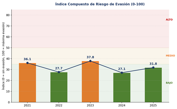 | El índice de riesgo de evasión muestra un patrón cíclico sin mejora sostenida | Oscila entre 27,1 y 37,8. Mejor momento en 2024 (27,1), deterioro en 2025 (31,8) |